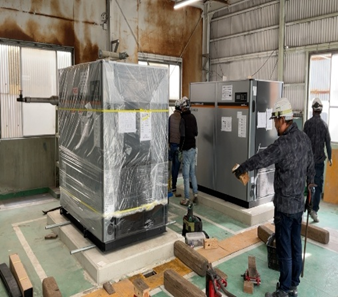 当社からは、現場の負荷状況・使用環境・既設設備の運用データを踏まえ、日立製の給油式スクリューコンプレッサー「インバータ機OSP-100VAN3 ×1台」と「定速機OSP-100M6AN3 ×1台」を組み合わせた最適な構成をご提案しました。インバータ機を活用することで負荷変動に柔軟に対応でき、定速機との併用により安定した圧縮空気供給体制を確保します。本更新により、旧設備と比較して運転効率が大幅に改善し、エネルギー使用量の最適化を実現しました。その結果、電力消費の削減だけでなく、二酸化炭素排出量の低減にもつながり、環境負荷の軽減に貢献しています。また、設備の信頼性が向上したことで安定稼働が確保され、長期的なランニングコスト削減も期待できる更新工事となりました。