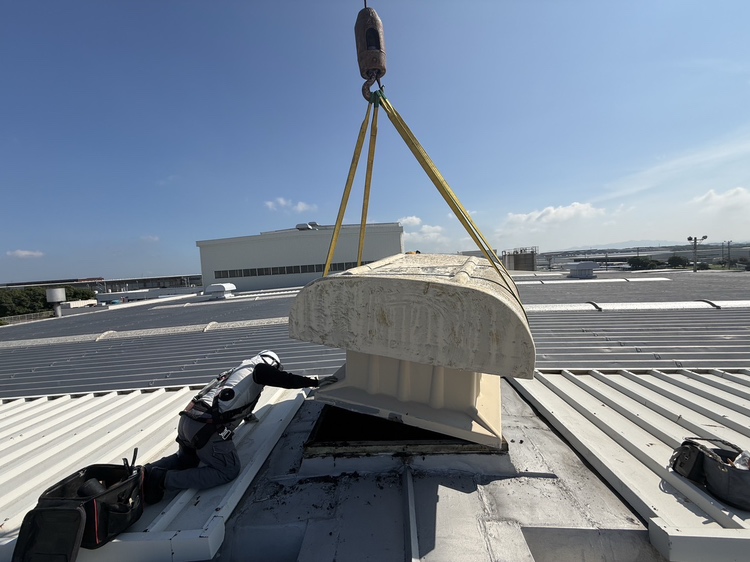 ルーフファンは、建屋内の熱気・湿気・臭気を排出する重要な設備であり、特に夏場の高温環境では設備稼働や作業環境の安全性にも影響します。今回の故障により、建屋内に熱気が滞留し、生産性の低下や従業員の作業負荷増大など、環境面での課題が顕在化していました。そのため、早急な機能回復が求められていました。